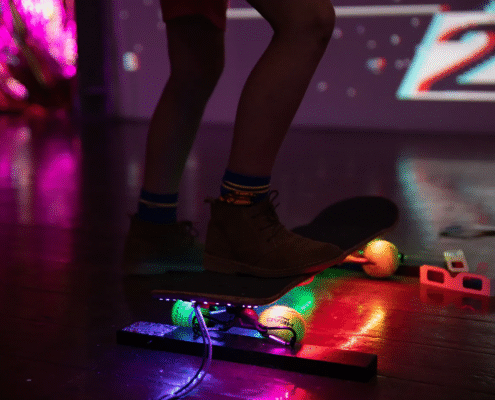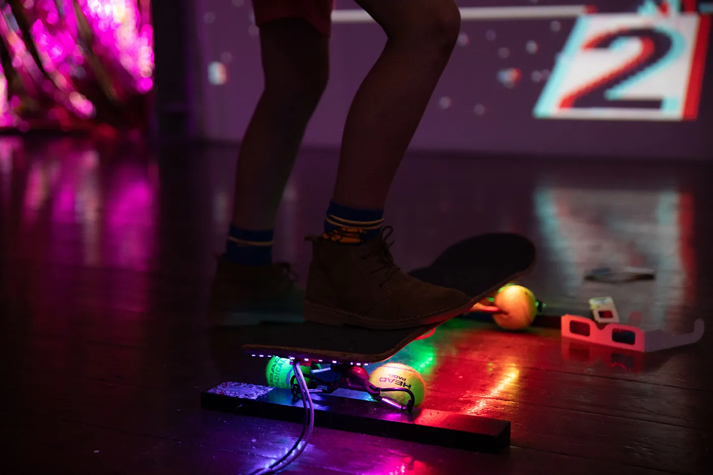 Crashboard is a skateboard hijacked into a game controller. In the game, you have to avoid waves of operating system windows pop-up interface scrolling in your direction while catching GIFs coming from the retro GeoCities web hosting service. You control the player position by leaning on the skateboard. The aesthetic of the game is crafted from glitch, retro web design and error system.