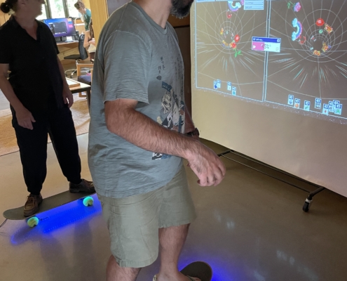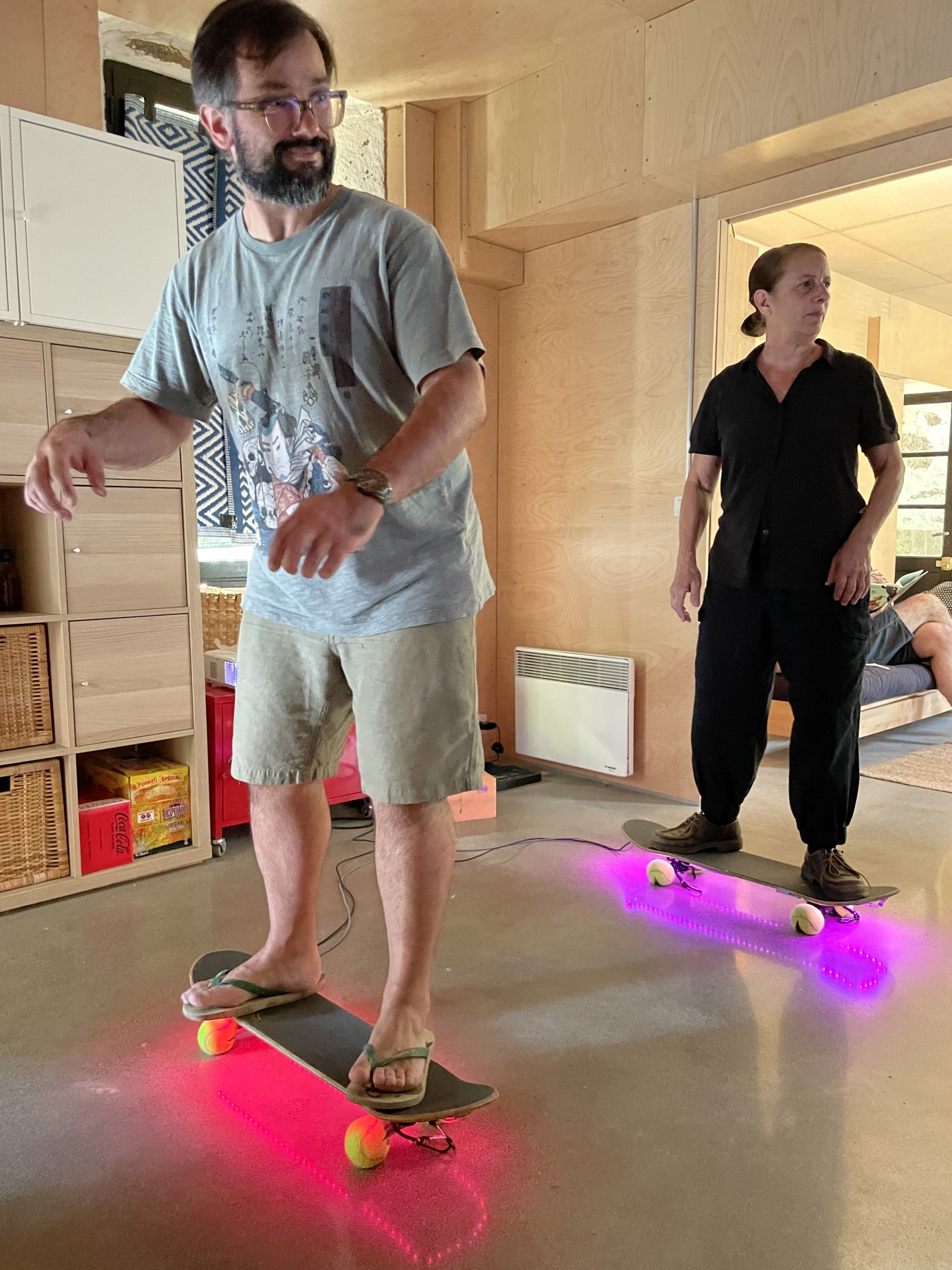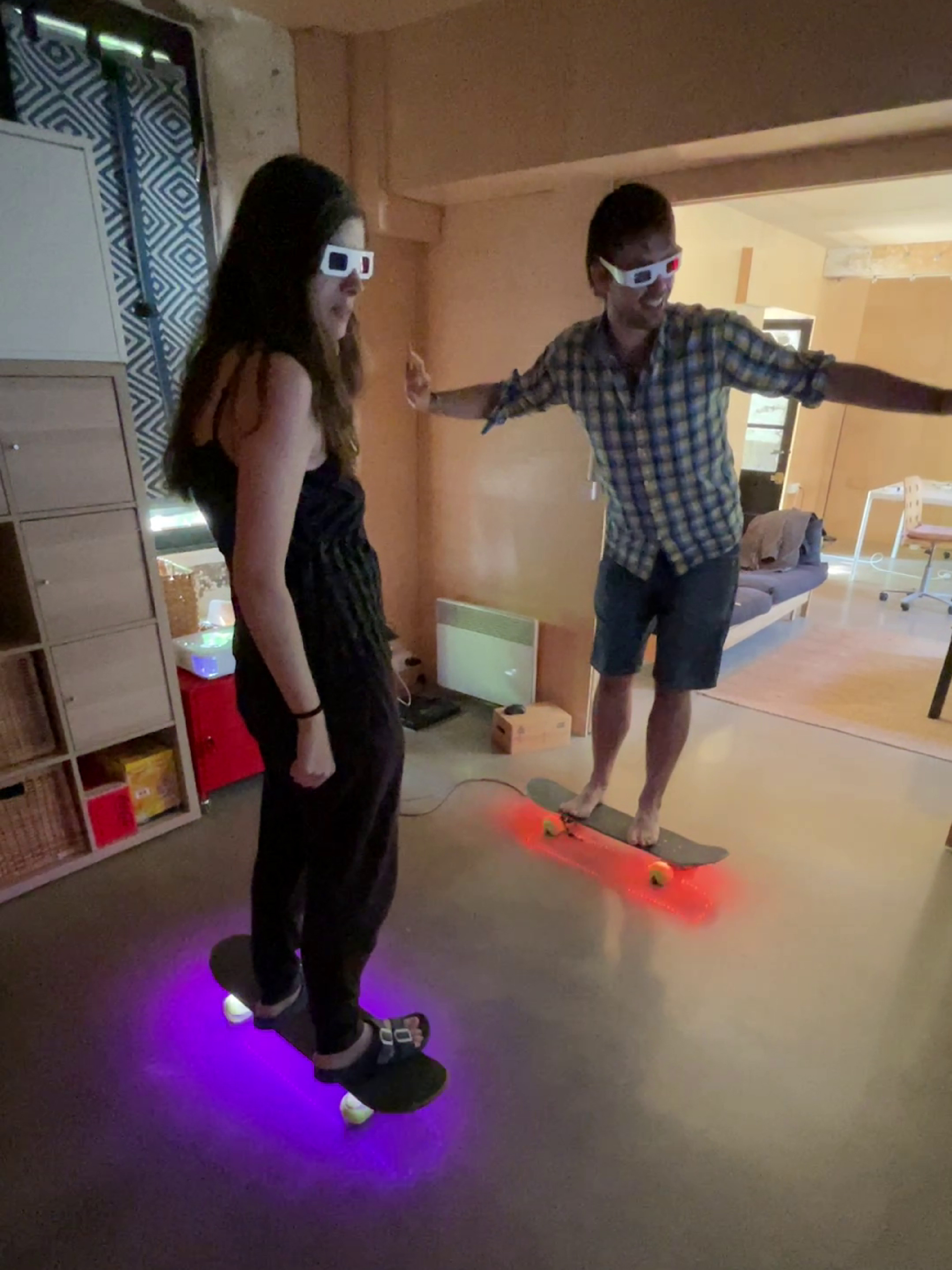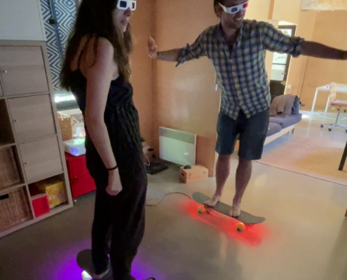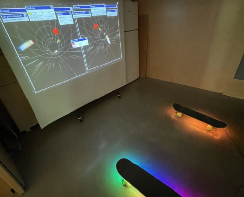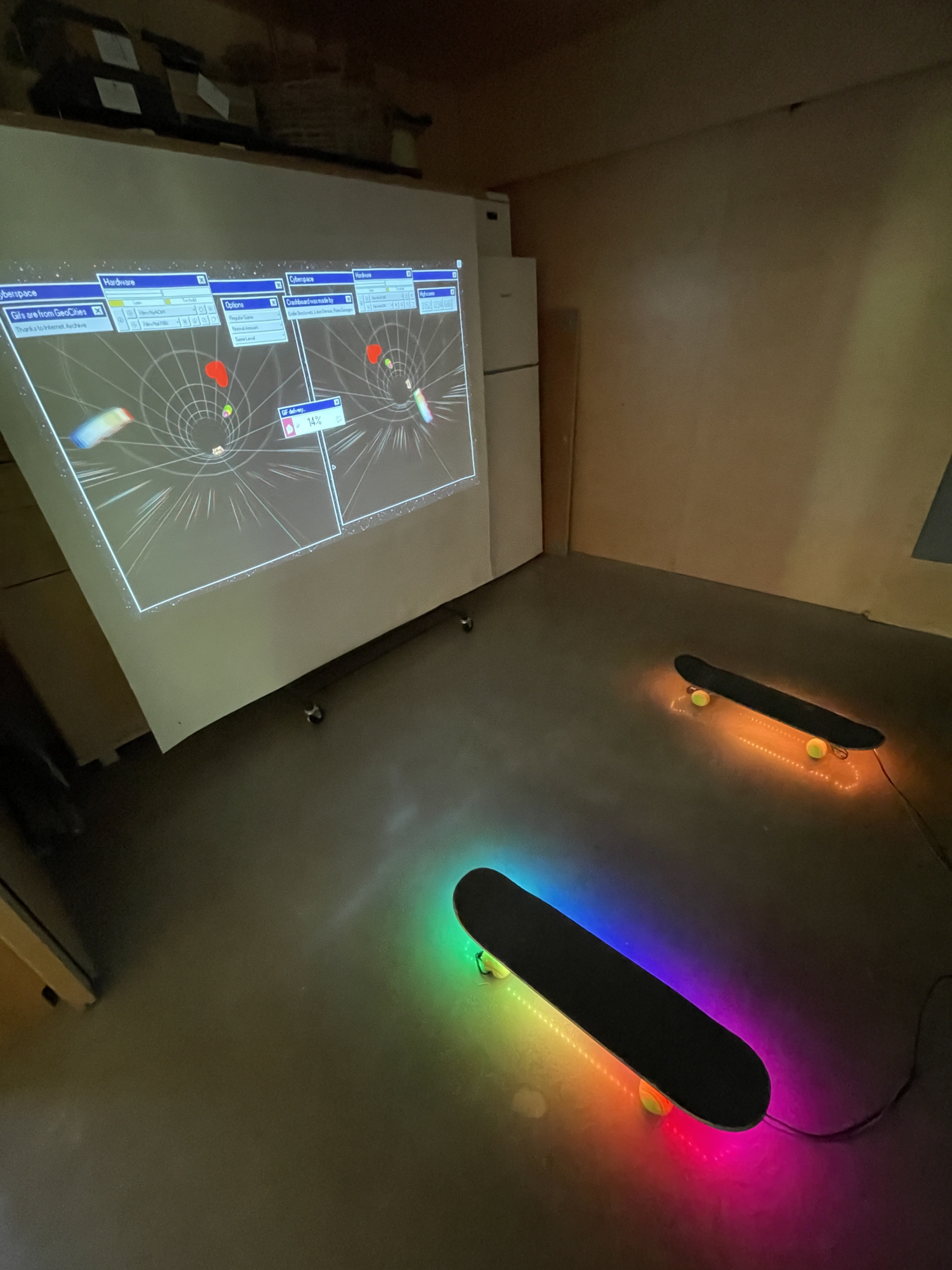 Crashboard 2000 is our new iteration of Crashboard, our hijacked skateboard to surf in the cyberspace with now two players competiting with each other.